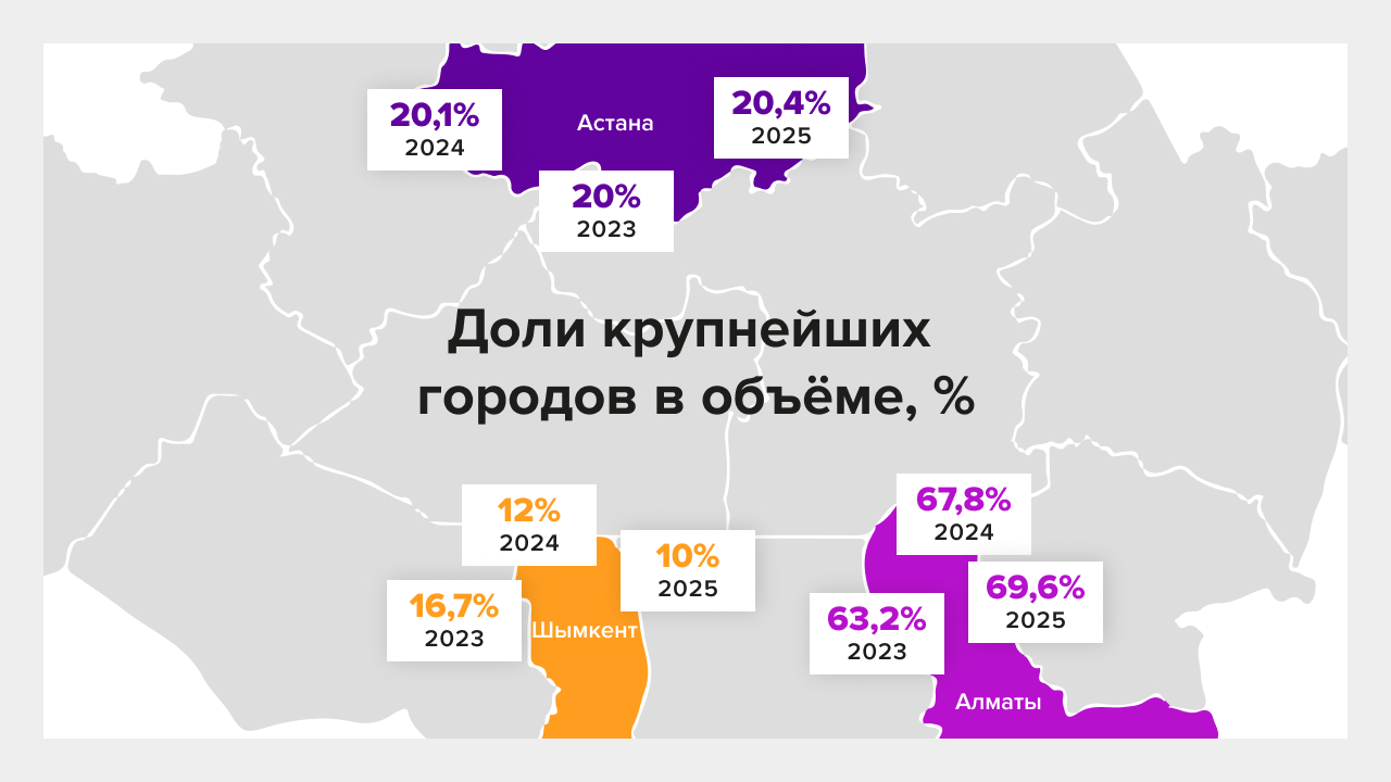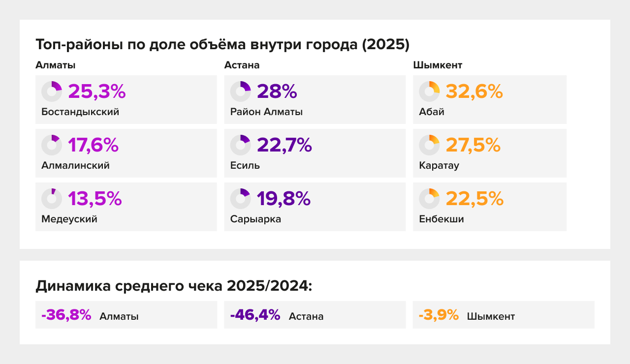 Алматы и Астана дают основной объём и основной рост, но при этом сильнее просаживают средний чек — то есть рост идёт через мелкие и более частые заказы.