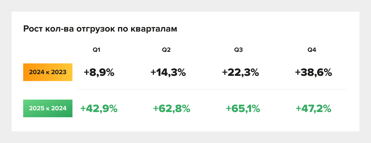 - рост обеспечивается количеством доставок, а не пропорциональным ростом «денег и веса»;