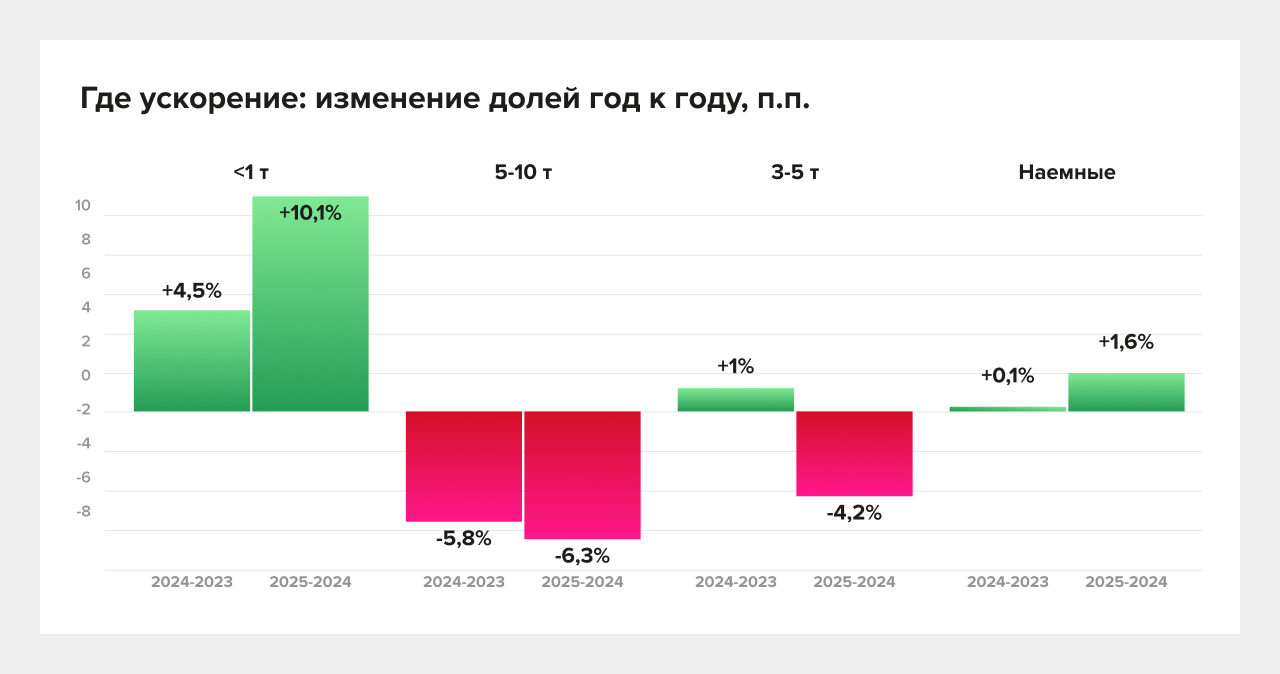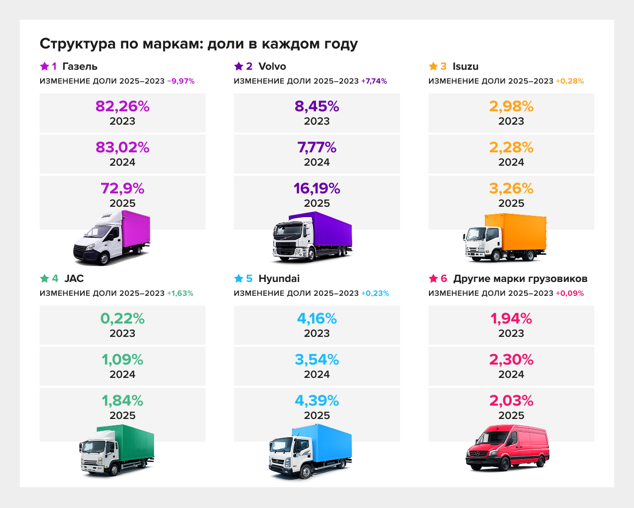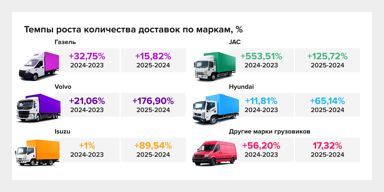 Газель остаётся базой: рост положительный и в 2024, и в 2025. Но в 2025 структура рынка меняется за счёт ускорения “усилителей”: Volvo показывает кратный рост и увеличивает долю, а JAC резко наращивает использование с низкой базы, становясь заметнее в структуре.