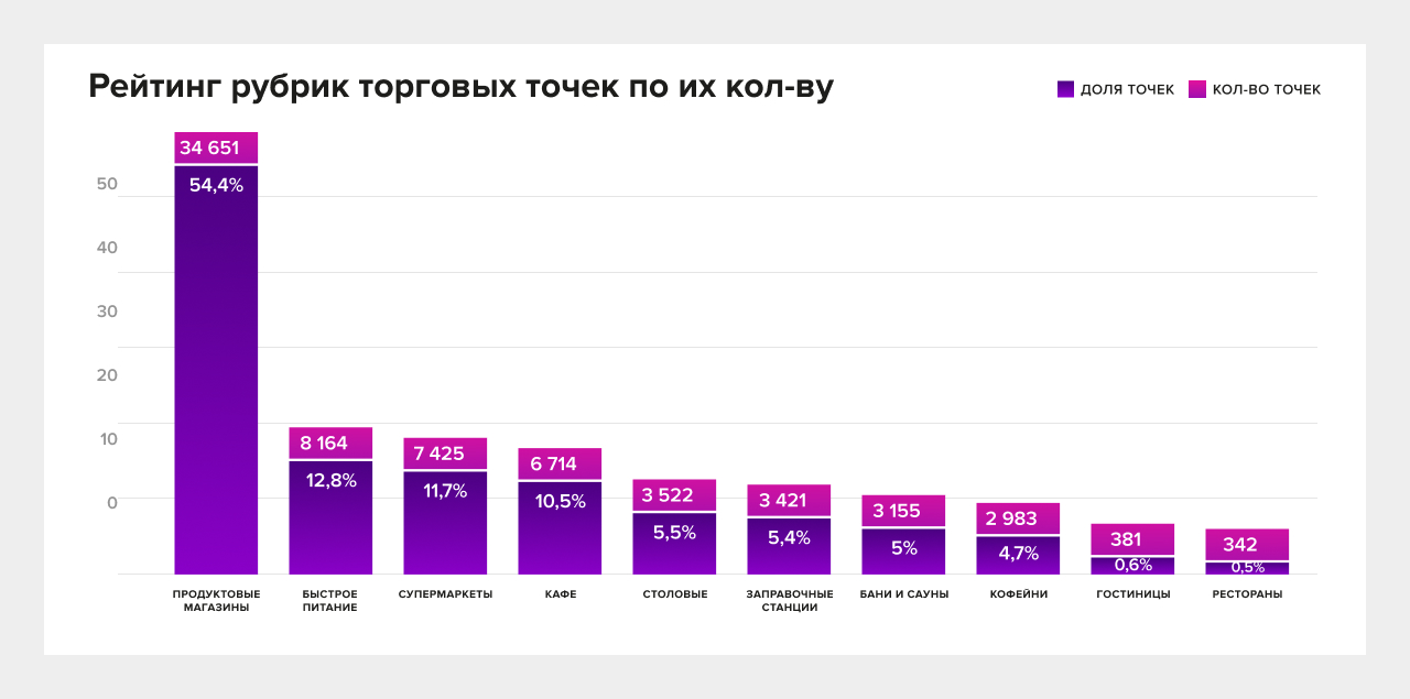 Топ-рубрики показывают, что «масса» инфраструктуры — это продуктовая розница и повседневная HoReCa (fast-food, кафе, кофейни, столовые). Более половины всей выборки (54,4%) — продуктовый сегмент. Это важно для интерпретации micro-drop: дробление появляется не как случайность или “плохое планирование”, а как закономерный ответ на структуру рынка, где огромное количество точек требует регулярного пополнения, а HoReCa усиливает временное давление. Эти сегменты формируют: