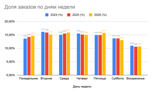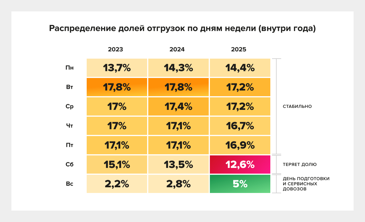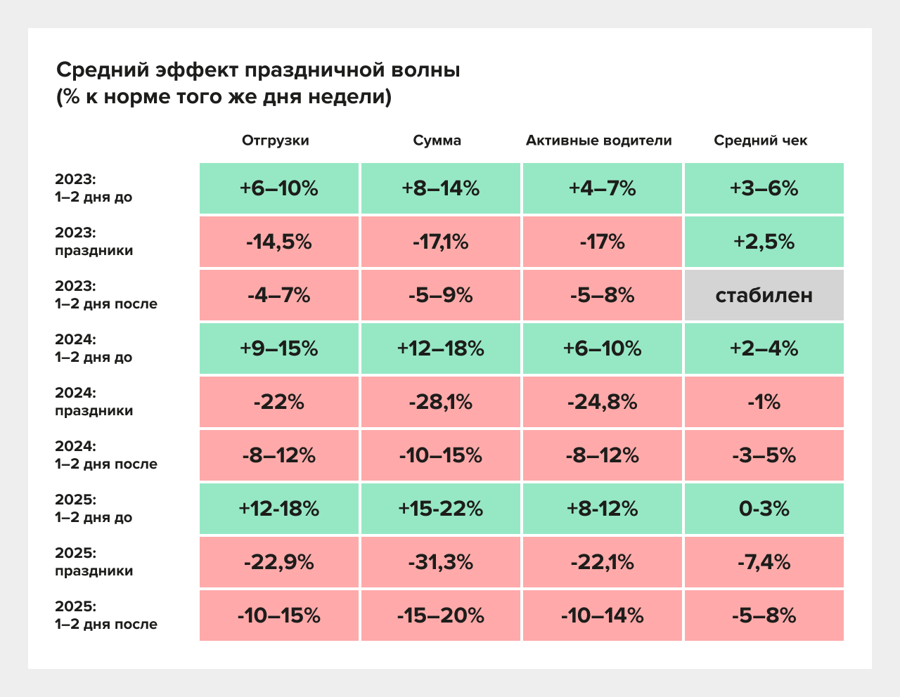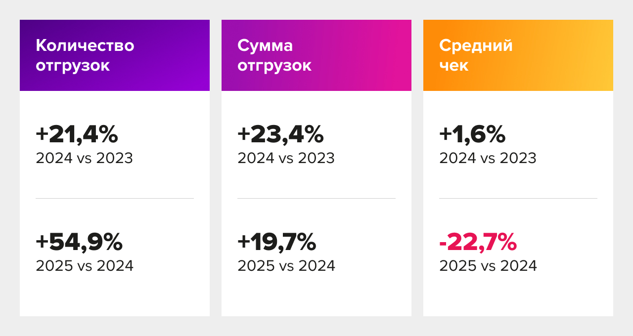 Праздники системно снижают объёмы, причём всё заметнее и по сумме, и по среднему чеку. Компании, которые заранее моделируют «праздничные волны», будут выигрывать по SLA и себестоимости.