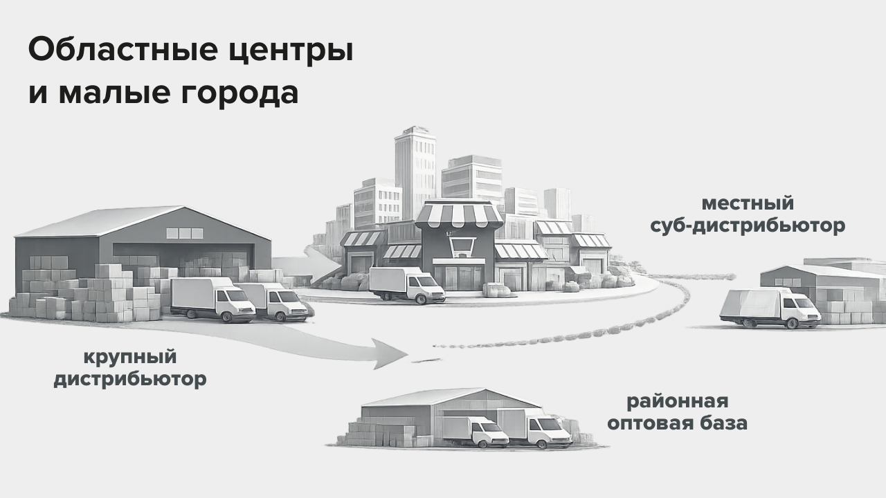 Фактически рынок делится на два слоя. Первый — мегаполисы с высокой долей modern trade, централизованными распределительными центрами и жёсткими требованиями к SLA. Второй — регионы, где традиционная розница и мелкий опт остаются системообразующими каналами, а суб-дистрибуция играет важную роль.