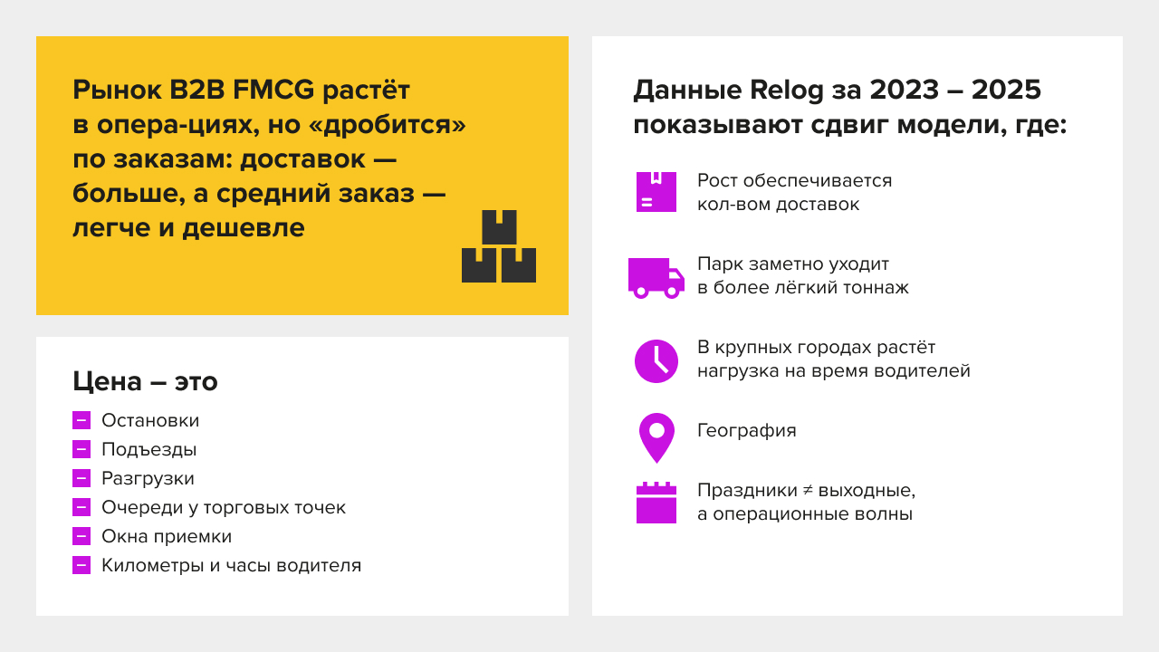 Это принципиально меняет экономику последней мили. Потому что в B2B-дистрибуции FMCG «ценой» является не только килограмм и не только выручка в накладной. Цена — это остановки, подъезды, разгрузки, очереди у торговых точек, окна приёмки, километры и часы водителя.