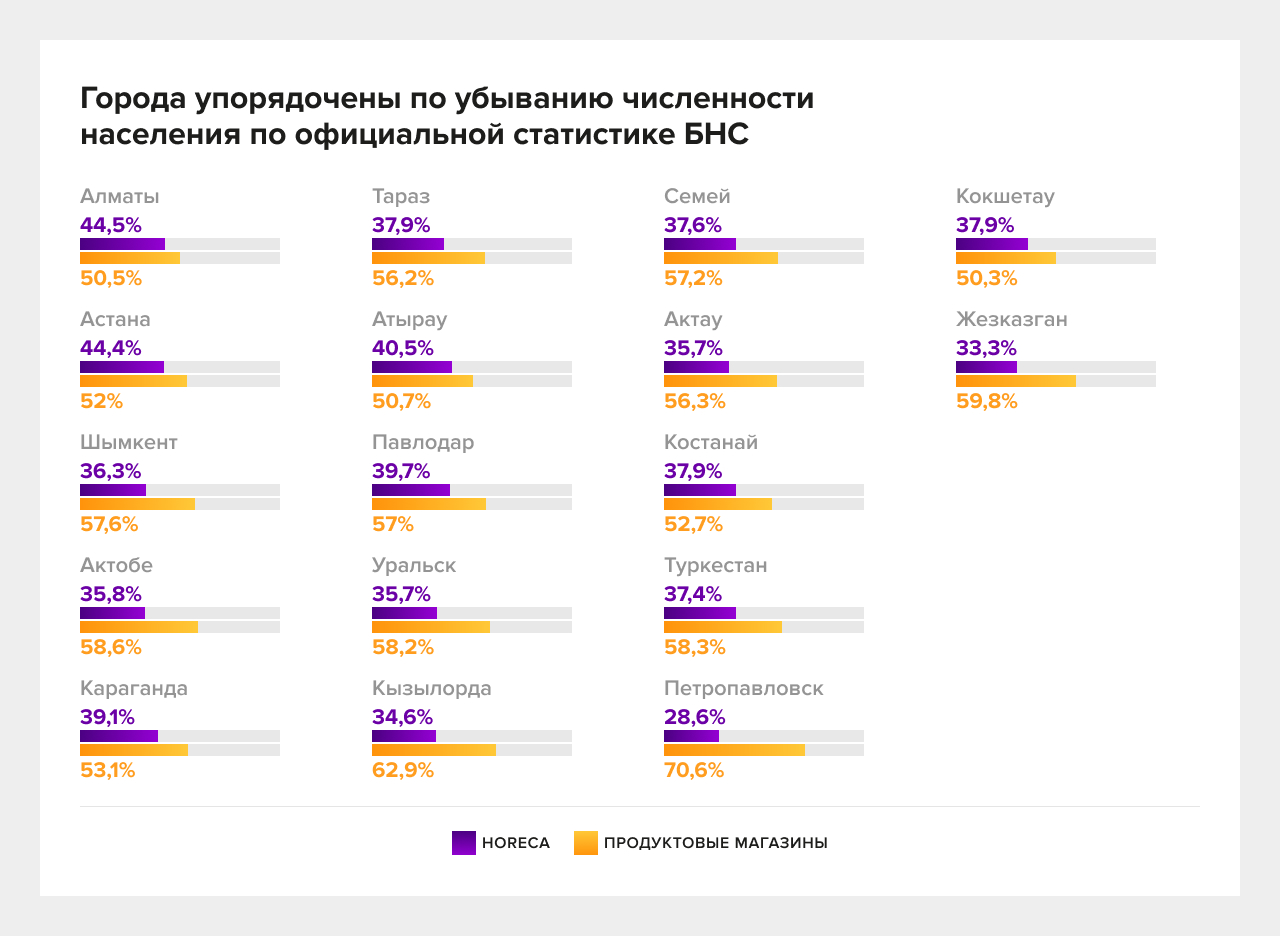 Шымкент и ряд региональных центров имеют очень высокую долю продуктовой розницы — это инфраструктура, которая подталкивает к micro-drop через постоянную потребность «подпитывать полку» небольшими партиями при высокой плотности точек. В таких городах micro-drop чаще является следствием “физики” мелкой розницы: высокий объём коротких остановок, высокая чувствительность к наличию и регулярные дозавозы небольшими партиями.