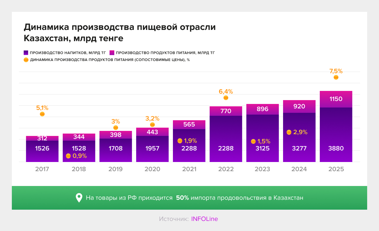 К 2025 году рынок FMCG-дистрибуции Казахстана окончательно перешёл из стадии фрагментированной модели к структурированной мультиканальной системе. Рост производства продовольствия усилил нагрузку на логистику: по данным INFOLine, за 2017–2025 гг. выпуск продуктов питания вырос более чем в 1,5 раза, напитков — более чем в 2 раза. Если в 2017 году совокупный объём производства составлял около 1,8 трлн тенге, то к 2025 году он превысил 5 трлн тенге. Такой прирост объективно требует более плотного покрытия торговых точек и усиления роли профессиональных операторов последней мили.