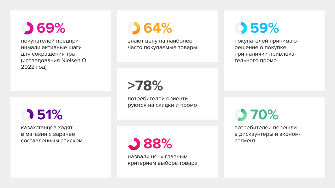 Экономия как образ жизни. Высокая инфляция и снижение реальных доходов сформировали у потребителей установку на экономию. Эксперты говорят об эффекте “покупательской усталости” от непрерывного роста цен. Ещё в 2022 году исследования NielsenIQ фиксировали, что 69% покупателей предпринимали активные шаги для сокращения трат. В 2023–2024 эта доля могла ещё увеличиться. Покупатели стали более планировать: по данным опросов, 51% казахстанцев ходят в магазин с заранее составленным списком покупок, стараясь избегать импульсивных трат. Они тщательно следят за ценами – 64% знают цену на наиболее часто покупаемые товары. Более 78% потребителей можно отнести к так называемым promo hunters – охотникам за акциями. То есть абсолютное большинство ориентируется на скидки, промо-предложения, выгодные большие упаковки. Промоакции и скидки стали базовым элементом маркетинга: 59% покупателей принимают решение о покупке товара, если видят привлекательное промо. И хотя отмечается некая усталость от бесконечных акций, потребительский запрос смещается к персонализированным промо – люди хотят получать скидки на то, что им действительно нужно, а не общие для всех предложения. В ответ ритейлеры и бренды усиливают программы лояльности, внедряют таргетированные купоны (например, через приложения больших сетей или банки, такие как Kaspi). Ещё одна стратегия экономии – смена брендов и мест покупки. Более половины потребителей (по некоторым данным ~70%) перешли на магазины с низкими ценами – дискаунтеры, оптовые рынки, эконом-сегмент – вместо прежних привычных мест. 49% целенаправленно сравнивают цены в нескольких торговых точках, тогда как в кризис 2016 г. так делали лишь 38%. Также массово происходит даунгрейд брендов: люди переключаются на более дешёвые марки товаров, в том числе на собственные марки сетей. Если раньше потребитель чаще был верен раскрученному бренду, то теперь цена становится решающим фактором в большинстве категорий (88% назвали цену главным критерием выбора товара). Особенно популярна экономия на товарах не первой необходимости, а вот на свежих продуктах и здоровье готовы не экономить: даже при ограниченном бюджете казахстанцы будут платить больше за качественное мясо, фрукты, товары для здоровья и красоты. Это диктует дистрибуторам и производителям необходимость иметь широкий ценовой ассортимент – предлагать как премиальные, так и бюджетные линейки, чтобы не терять потребителя. Также важно обеспечить постоянное наличие промо-предложений: ротация скидок и акций должна быть продуманной, чтобы поддерживать интерес, но не загнать бизнес в убыток. Компании инвестируют в Big Data-анализ корзин – выясняют, на чем покупатель экономит, а за что готов доплатить, и выстраивают промо-стратегии соответственно.