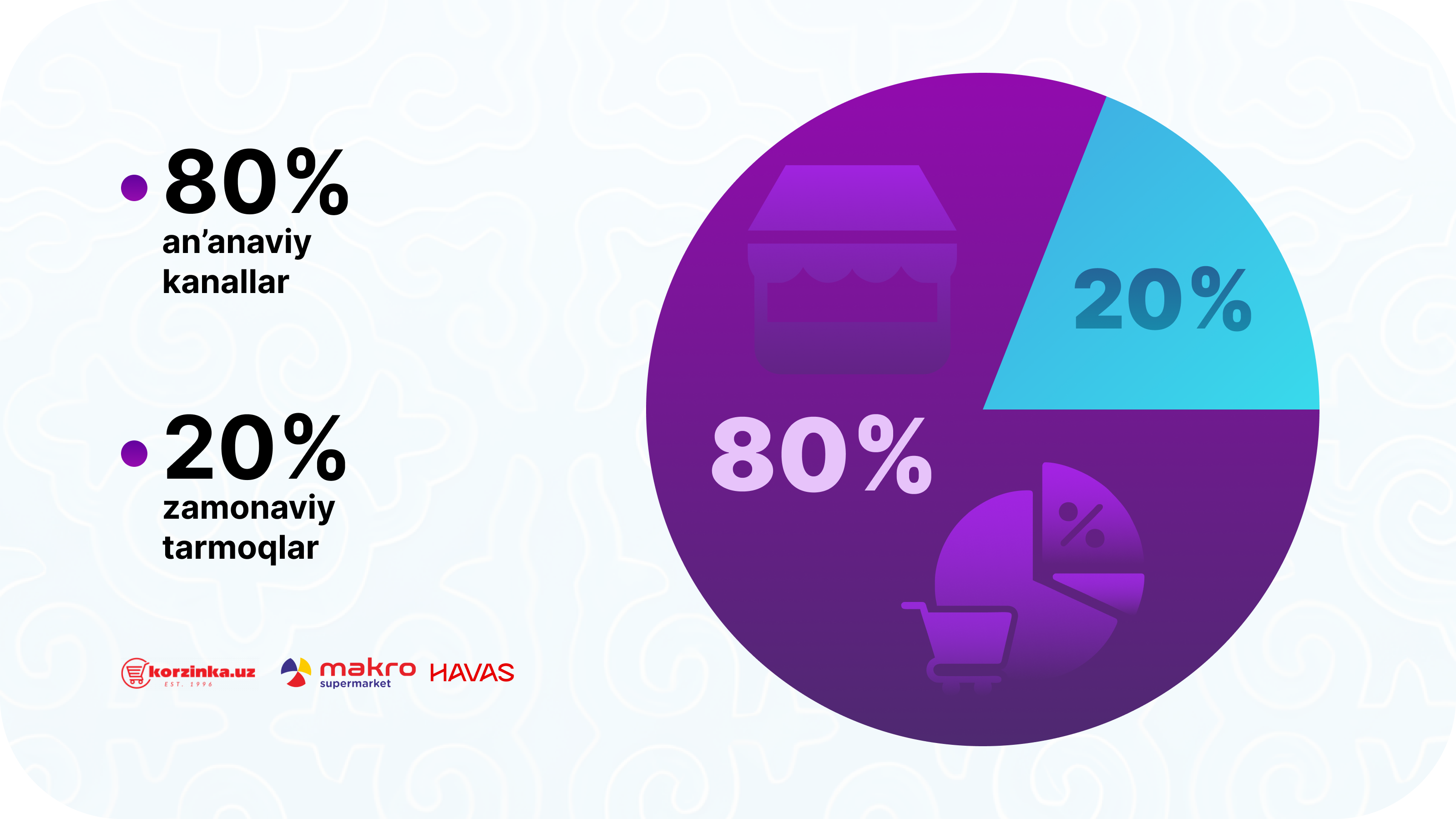 2024 yil yakunlariga ko'ra, O'zbekiston chakana savdo aylanmasi +9,9 foizga (31,1 mlrd dollar ekvivalentigacha) o'sdi. Ushbu hajmning katta qismi hali ham an'anaviy savdo – bozorlar va kichik do'konlar tomonidan ta'minlanadi. Mamlakatda 47 mingga yaqin do'kon mavjud, ulardan atigi ~13,7 mingta oziq-ovqat do'konlari mavjud. Zamonaviy tarmoq supermarketlari (masalan, Korzinka, Makro, Havas va boshqalar) hozircha bozorning atigi 15-20 foizini egallaydi, qolganlari an'anaviy kanallarga to'g'ri keladi. Aholining 75% dan ortig'i muntazam ravishda bozorlarda xarid qiladi. Taqqoslash uchun, Rossiyada tarmoq chakana ulushi ~80%. Shunday qilib, O'zbekiston noyobdir, chunki an'anaviy chakana savdo hali ham ustunlik qiladi – bu bir tomondan etkazib berish kontsentratsiyasini cheklaydi, boshqa tomondan tarqatishda yuqori yukni keltirib chiqaradi, chunki minglab kichik nuqtalarni muntazam ravishda kichik etkazib berish bilan qoplash kerak. Shunga qaramay, konsolidatsiya tendentsiyasi yaqqol ko'rinib turibdi: O'zbekistonning eng yirik tarmoqlari tez sur'atlar bilan kengayib bormoqda (2024 yilda eng yaxshi tarmoqlar do'konlar sonini o'rtacha +29% ga oshirdi). Hech bir tarmoq ~200 nuqtadan oshmagan bo'lsa-da, tahlilchilar urbanizatsiya va xaridorlarning odatlarining o'zgarishi tufayli 2028 yilga kelib zamonaviy tarmoqlar ulushining ~35% gacha o'sishini taxmin qilishmoqda.
