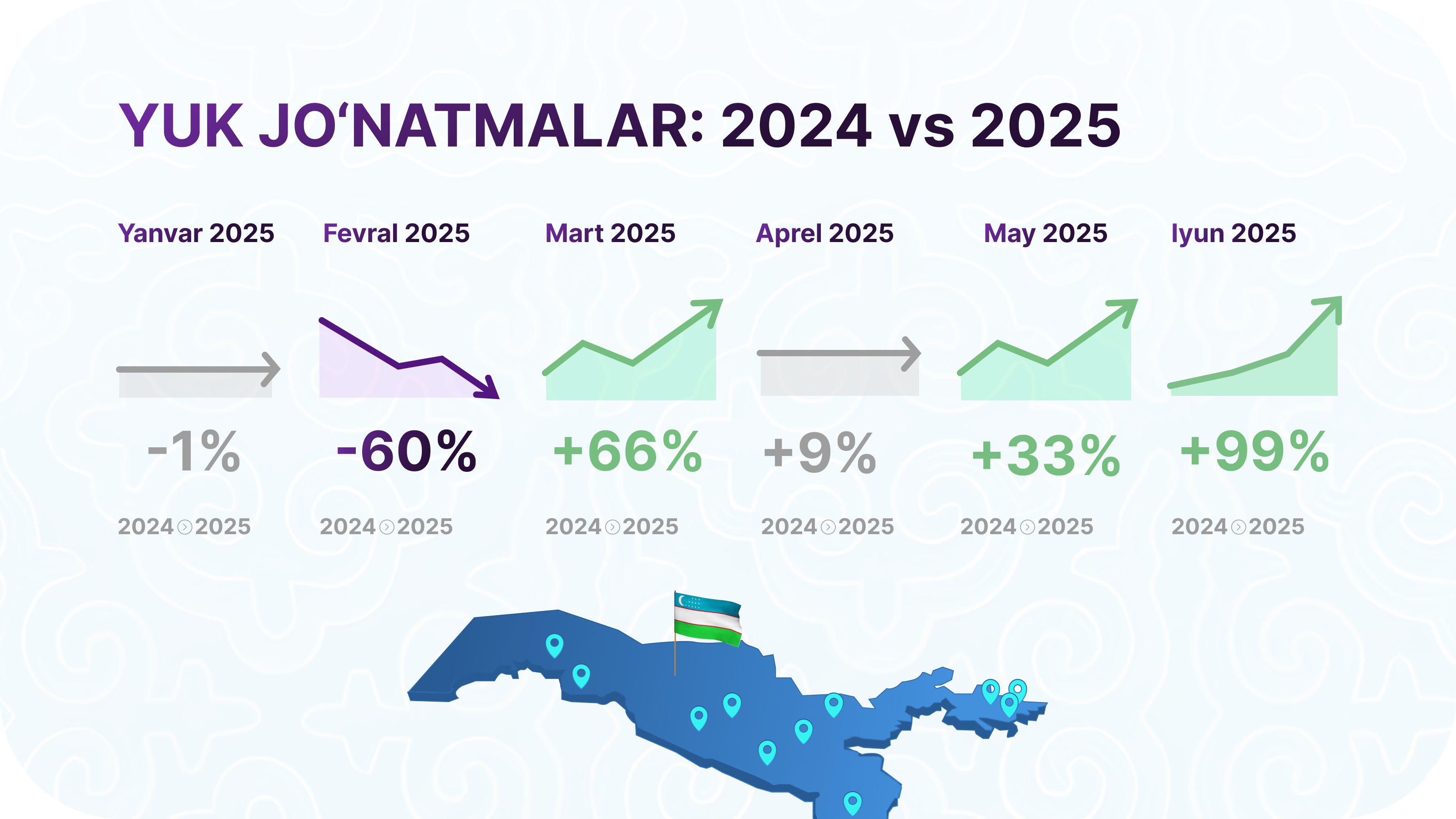 Relog ma'lumotlariga ko'ra, 2025 yilda yuk tashish dinamikasi sezilarli tebranishlarga ega edi, ammo umuman olganda 2024 yilga nisbatan o'sishni ko'rsatdi. 2025 yil yanvar oyida B2B buyurtmalari soni 2024 yil yanvar oyiga nisbatan deyarli o'zgarmadi (taxminan -1%). Biroq, 2025 yil fevral oyida jo'natmalar sonining -60% dan ko'proq pasayishi kuzatildi. Aksincha, 2025-yil mart oyida faollik keskin oshdi, buyurtmalar soni 2024-yil martiga kelib taxminan +66% ga oshdi. Bundan tashqari, 2025 yil aprel oyida jo'natmalarning o'rtacha o'sishi (~+9%) saqlanib qoldi, 2025 yil may oyida esa dinamikaning +33% gacha tezlashishi kuzatildi. Maksimal sakrash 2025 yil iyun oyida, o'tgan yilning iyun oyiga nisbatan buyurtmalar soni deyarli ikki baravar ko'payganida (taxminan +99%) sodir bo'ldi. Bunday keskin tebranishlar jo'natmalarning o'zgargan jadvali va mavsumiyligini ko'rsatadi: 2025 yil qish oxiridagi faoliyatning muvaffaqiyatsizligi bahor va yozning boshlarida tez o'sishga yo'l ochdi.