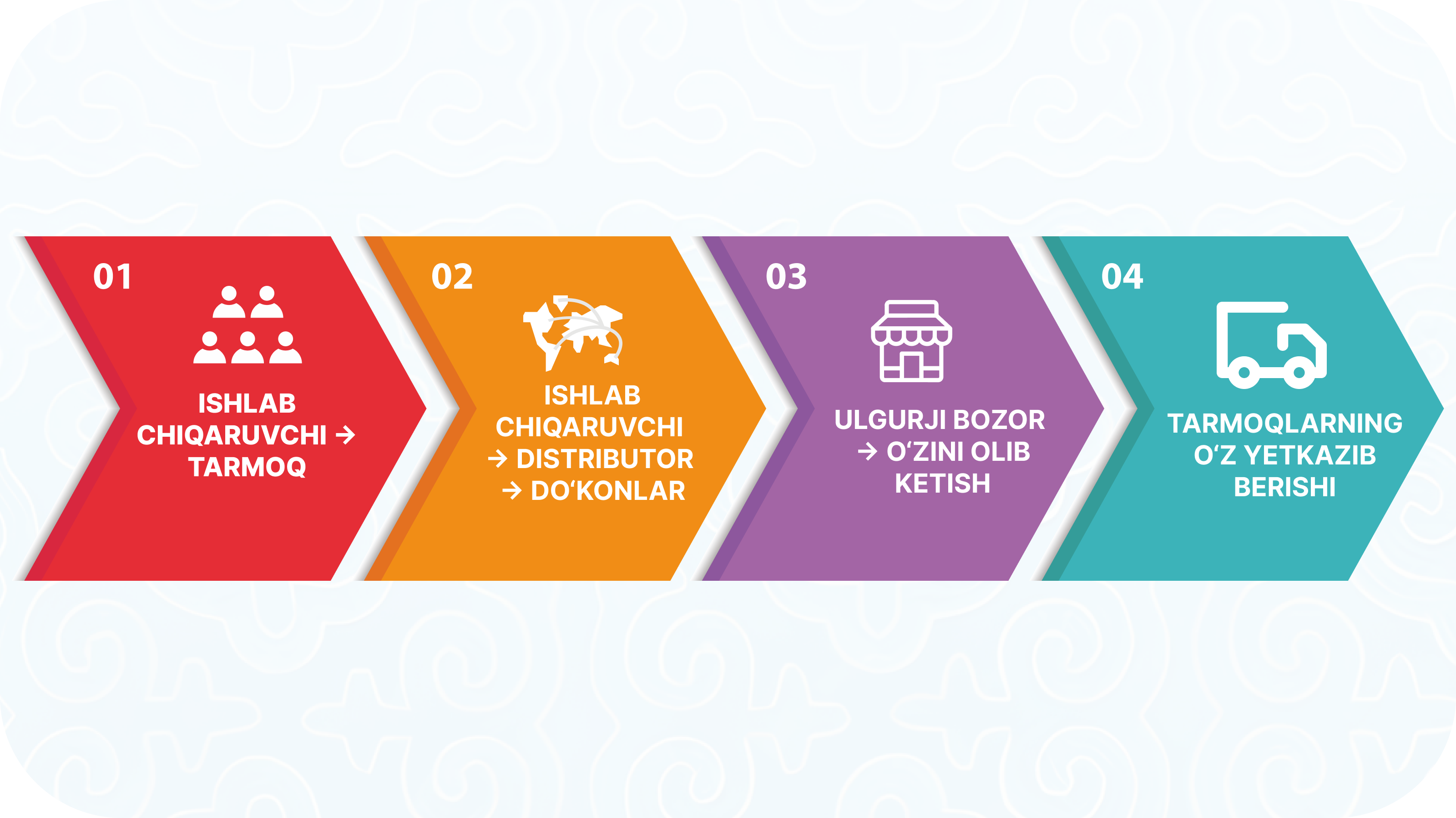 - Ulgurji bozorlar orqali: tovarlarning bir qismi uyushgan etkazib berish tarmoqlari orqali emas, balki do'kon egalarining o'zlari tovarlarni ulgurji markazlardan yoki ulgurji bozorlardan (masalan, Toshkentdagi oziq-ovqat bazalari) sotib olishlari orqali tarqatiladi. Keyin" oxirgi mil " aslida chakana sotuvchining o'zi tomonidan amalga oshiriladi: u mustaqil ravishda tovarlarni o'z joyiga olib boradi. Ushbu an'anaviy format hali ham mazmunli, ammo asta-sekin etkazib berish bilan tarqatishga yo'l ochadi.