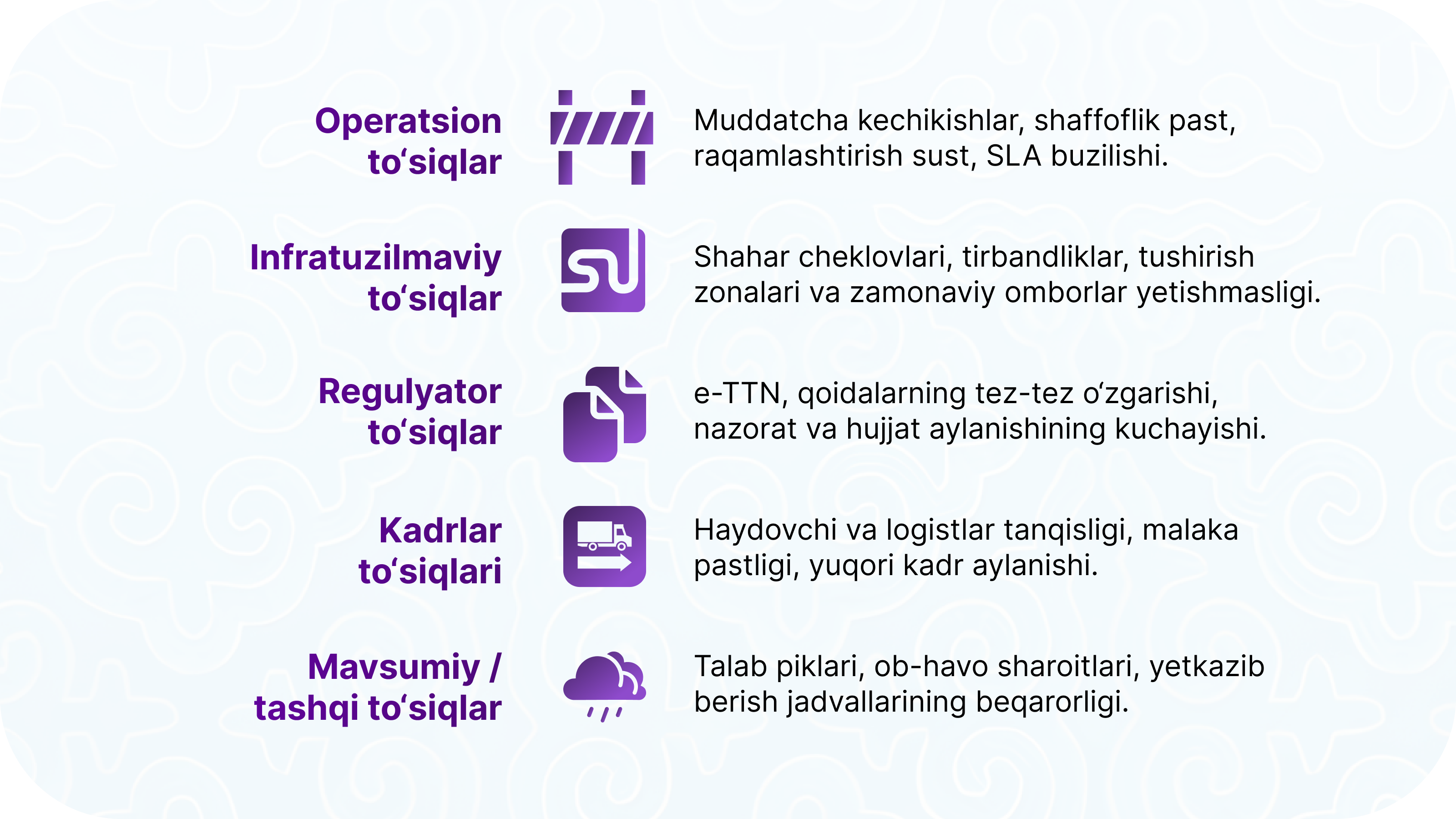 1. Belgilangan muddatlar va xizmat ko'rsatish sifati. Yetkazib berish muddatining buzilishi chakana savdo uchun o'tkir og'riq bo'lib qolmoqda. Do'konlar mashinalarning kechikishi, buyurtmalarning to'liq to'ldirilmaganligi, tushirish paytida xatolar haqida shikoyat qiladilar. Raqobat kuchayib borayotgan bir paytda, hatto kichik do'konlar ham aniqlikni qadrlay boshlaydilar – agar bitta etkazib beruvchi doimiy ravishda kechiksa, egasi boshqasini topadi. So'rovlarga ko'ra, onlayn chakana sotuvchilarning 67 foizi so'nggi milda qiyinchiliklarga duch kelgan, bu esa mijozlarni yo'qotishiga olib kelgan. B2B segmentida yo'qotishlar unchalik ommaviy emas, lekin ayni paytda muhim: kichik do'kon ma'lum bir distribyutordan buyurtma berishni to'xtatishi mumkin, agar u tovarlarni kelishilgan soatga bir necha marta olib kelmasa va javonlar bo'sh bo'lsa. Buzilishlarning sabablari har xil: inson omili (haydovchi uxlab qoldi, manzilni noto'g'ri tushundi, ekspeditor butun partiyani etkazmadi), texnik muammolar (yo'lda mashinaning buzilishi), ob-havo sharoiti (yomg'ir, issiqlik, muz harakatni sekinlashtirdi), ma'lumotlar bazasidagi noto'g'ri manzillar (muammo dolzarbdir, chunki ko'plab ko'chalar qayta nomlanadi yoki do'konlarda aniq raqamlar-haydovchi qidirib yurishi mumkin). Bundan tashqari, O'zbekistonda mijozlar punktlari ko'pincha kelishuvlarni buzishadi: do'kon tushlikdan keyin olib kelishni so'rashi mumkin edi, lekin aslida u oldinroq yopilgan va mashina hech kimni topmagan. Chakana savdoning bir qismida rejalashtirish madaniyatining yo'qligi ham to'siqdir: "ertaga biron bir narsani olib keling", logistika hayotini murakkablashtirmaydi. Ushbu omillarning barchasi etkazib berishning sezilarli foizini jadvaldan chetga chiqish bilan birga olib keladi. Shu sababli, savdo nuqtalarining ishonchi va qoniqishi pasayadi, nizolar va o'zaro tanbehlar paydo bo'ladi. B2B-dagi xizmat asta-sekin birinchi o'ringa chiqadi: mutaxassislarning ta'kidlashicha, etkazib berish sifati B2B bozorida farqlovchi bo'lishi mumkin, agar tovarlarning o'zi raqobatchilarga o'xshash bo'lsa. Hozirda ba'zi distribyutorlar do'konlarning haydovchilar ishidan qoniqish ko'rsatkichlarini (yukdan keyingi so'rov) amalga oshirmoqdalar va ushbu baholashlardan xodimlarni mukofotlash uchun foydalanmoqdalar. Mijozlarga yo'naltirilgan bunday yondashuv hali ham yangi, ammo uni zarur deb hisoblaydigan kompaniyalar soni ortib bormoqda.