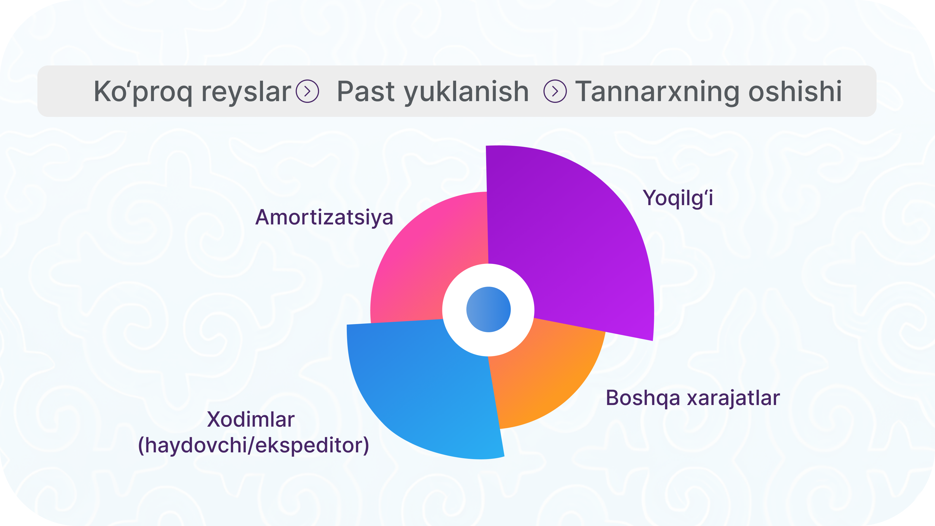 Xarajatlar tarkibi boshqa tarkibiy qismlarni ham o'z ichiga oladi: amortizatsiya va avtoulovlarga texnik xizmat ko'rsatish, soliqlar, IT/dispetcherlik xarajatlari, omborlarni ijaraga olish, qadoqlash va qadoqlash va boshqalar. Ammo bu maqolalarning ulushi kamroq. Bundan tashqari, samarasizlikdan yashirin yo'qotishlar mavjud: transportning kam yuklanishi keng tarqalgan muammo. Mutaxassislarning hisob-kitoblariga ko'ra, kompaniyalarning 40 foizigacha parkni samarasiz yo'q qilish bilan shug'ullanishadi: juda ko'p bo'sh yurish, marshrutda yarim bo'sh mashinalar, o'ylab topilmagan qaytish reyslari. O'zbekistonda bu ham dolzarbdir – chakana savdo tarqalib ketganda, yuklarni birlashtirish qiyin; yuk mashinasi yarim to'la tanasi bilan 100 km masofani bosib o'tishi odatiy hol emas. Sabablari-rejalashtirish va muvofiqlashtirishning kamchiliklari: savdo agentlari o'z vaqtida etarli miqdordagi buyurtmalarni to'play olmasligi mumkin, logistlar har doim ham etkazib berishni yaqin nuqtalarda sinxronlashtirmaydilar, ishlab chiqaruvchilar o'rtasida qo'shma logistika mavjud emas. Natijada, har bir kompaniya alohida-alohida katta xarajatlarni o'z zimmasiga oladi, garchi nazariy jihatdan xarajatlarning bir qismi hamkorlik orqali optimallashtirilishi mumkin (masalan, turli xil etkazib beruvchilarning yuklarini bitta marshrutga birlashtirish). Bozorda ishonch va integratsiya darajasi past bo'lsa-da, har kim faqat o'z zanjirini optimallashtiradi.