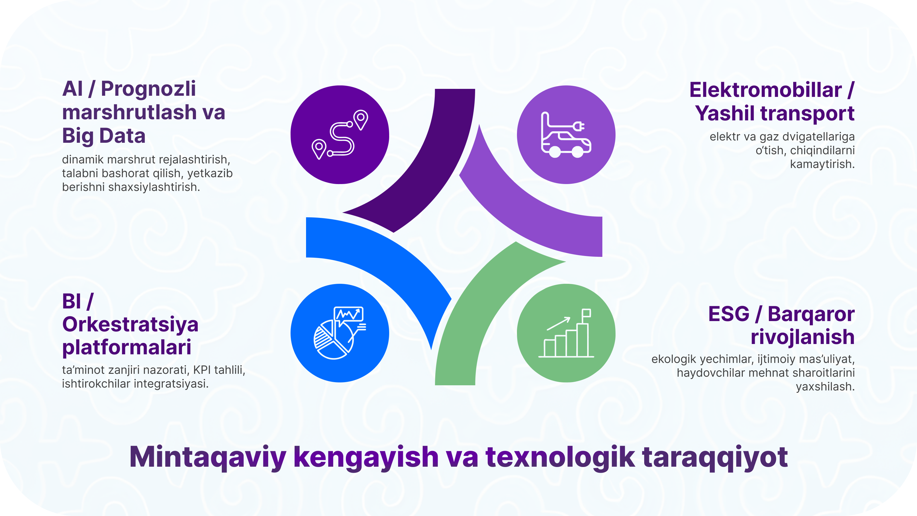 ESG, BI-analitika, taxograflar va «yashil» tashabbuslar ertangi norma tarkibiga kiradi. Bugun innovatsiya va barqaror infratuzilmaga sarmoya kiritayotgan kompaniyalar — ertangi texnologik yetakchilar. Ular xalqaro buyurtmachilar va tarmoq riteyli uchun eng qiziqarli hamkorlarga aylanadi.